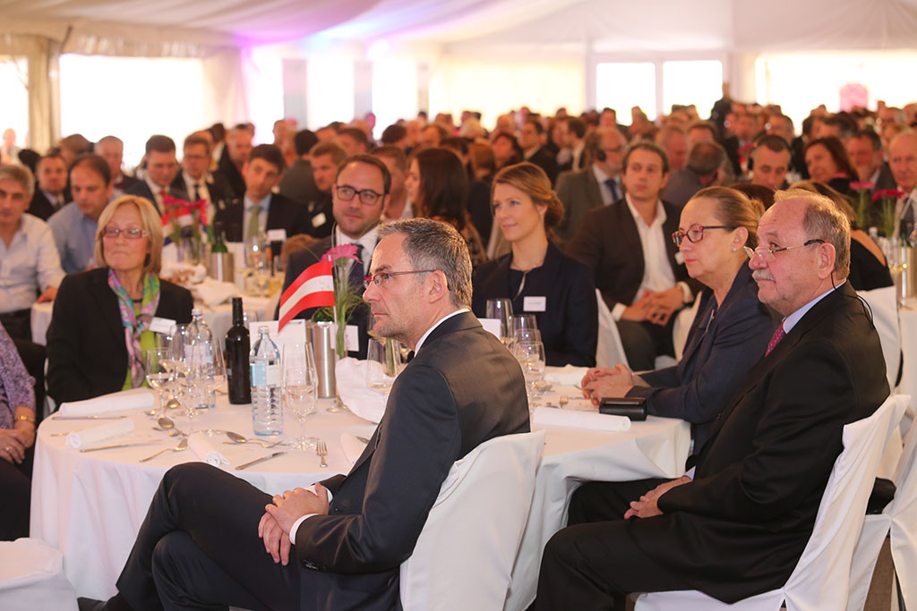 S leva na desno: Zamenik guvernera Donje Austrije, Wolfgang Sobotka; Leo Schirnhofer; Lukas Schirnhofer, MInistar finansija Republike Austrije, Hans-Jörg Schelling; foto: Conny de Beauclair, Polytechnik GmbH