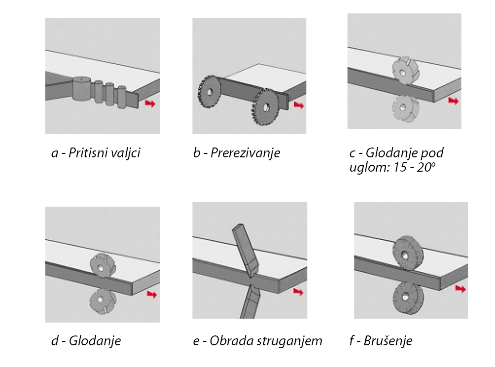 1c,d – Operacija glodanja viška kant trake. Ova operacija obavlja se pomoću 4-6 glodala sa prečnikom približno 70 mm odgovarajuće rotacione brzine. Ukoliko je velika brzina glodanja može doći do oštećenja površine.