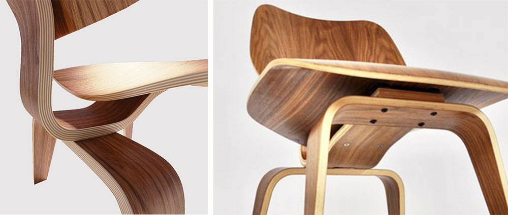 Sledeći korak je bilo savladavanje istog zadataka, ali tako da se umesto metalne baze napravi odgovarajuća od drvenih otpresaka. Rezultat je bila stolica LCW (Lounge Chair Wood), elegantnog i modernog izgleda koja unosi revolucionarni preokret u svetu dizajna nameštaja. Njene biomorfne krivine na sedištu i naslonu pratile su oblik ljudskog tela i činile je veoma udobnom. Međutim, pričvršćivanje elemenata predstavljalo je ozbiljan dizajnerski izazov. Čarls i Rej su hteli da izbegnu bušenje otpreska, što zbog estetskih razloga, a što zbog njegovog potencijalnog oslabljivanja, pa su dugo tragali za prihvatljivom opcijom. Rešenje su našli u amortizerima od gume koji se koriste u automobilskoj industriji. U želji da obezbede odgovarajuće šrafljenje, razvili su podlošku sa gumom i ugrađenim šrafom kao i poseban način njenog lepljenja na poleđini otpreska, koji su kasnije i patentirali. Ipak, ovaj spoj je dugo zbog nedovoljne pouzdanosti bio i dizajnerski nedostatak stolice. Lepljena površina se naime mogla odvojiti iz mnogo razloga i učiniti stolicu neupotrebljivom. Najjednostavniji izlaz iz problema bi bilo povratak na bušenje otpreska i vidljiv spoj, ali to nije bila prihvatljiva opcija za Čarlsa i Rej. Zahvaljujući upornosti i strpljenju, kao i razvoju materijala i tehnologija vremenom se došlo do efikasnog rešenja koje se i danas koristi.