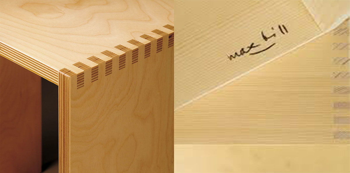 Na slici je detalj spoja dve ploče koji omogućava stabilnu i trajnu konstrukciju. Svi originalni proizvodi imaju žig sa potpisom Maksa Bila.
