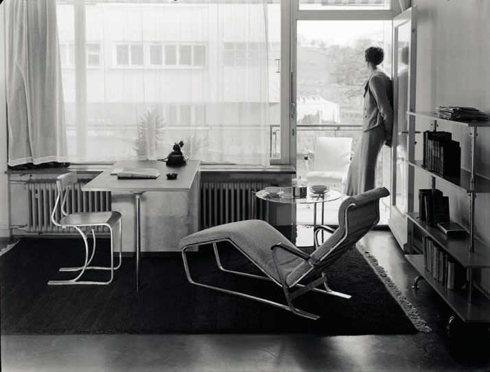 Enterijer stambenog prostora u Ajsikon zgradi opremljen Brojerovim nameštajem. Ležaljka od aluminijuma je ovde u tapaciranoj varijanti.