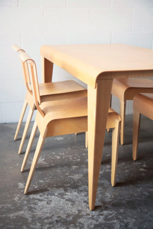 Ajsikon stolica ima mogućnost da se slaže jedna na drugu. Ovde je prikazana uz odgovarajući trpezarijski sto (model BT3) projektovan iste 1936. godine.