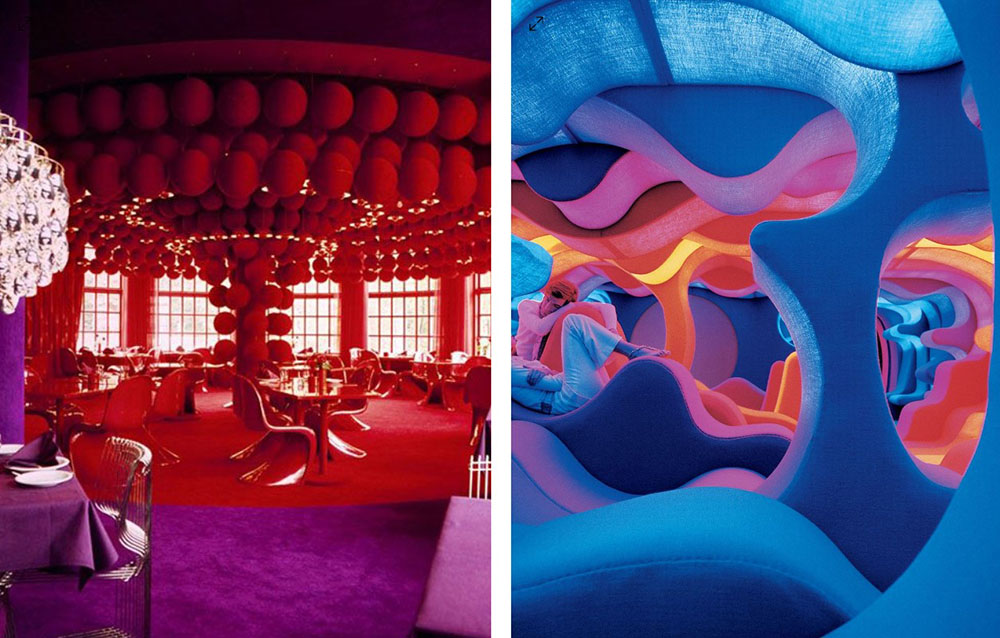 Društvo 1970-ih obeležili su društveni pokreti, poput borbe za ljudska prava, osnaživanje žena i ekološka svest. Sloboda izražavanja i individualizam reflektovali su se u enterijerima kroz smela dizajnerska rešenja i eksperimentisanje sa formama, bojama i funkcionalnošću prostora. Autor oba enterijera je Verner Panton.