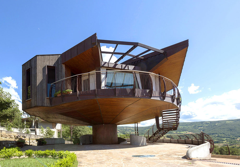 Italijanski arhitekta Roberto Rosi autor je interesantne kuće u ruralnoj oblasti nadomak Riminija na severu Italije. Kuća je napravljena od drveta, kao lakog, a čvrstog i izuzetno zahvalnog materijala za gradnju još od pamtiveka. Osnova kuće je osmougaona i razvijena na 150 m2 površine osnove, a forma i funkcija su dizajnirani tako da pruže vlasnicima maksimalno uživanje u vizurama. Naime, ambijent je izuzetno živopisan i sačinjavaju ga šaroliki brdoviti predeli, plodne zelene nizije i krševite planine u daljini. Da bi sve ovo moglo da se sagleda u punoj lepoti i intenzitetu doživljaja, uveden je kuriozitet – kuća ima mogućnost rotacije i to u punom kružnom opsegu (360 stepeni).
