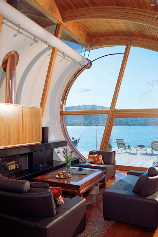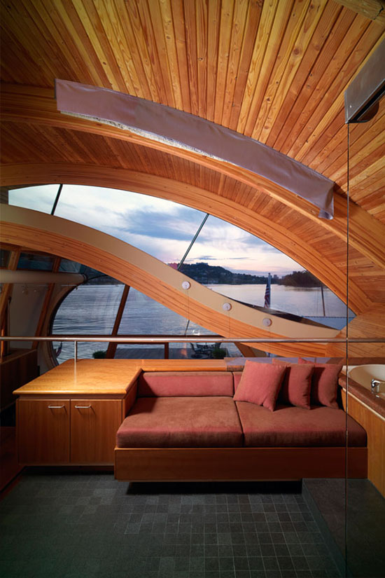 Dva osnovna simbola kompozicije ove kuće-broda jesu krug i talas. Prvi je u vezi sa ciklusom vode u prirodi, a drugi sa osnovnim principom njenog delovanja. U plastičnom smislu ovaj princip rezultovao je izostankom uglova i euklidovske geometrije u prostoru, budući da ih i sama Priroda ne sadrži. Arhitekta Robert Harvej Ošats, poznat po svojim drvenim kućama u šumi, sa lakoćom i umećem je preneo svoju strast projektovanja konstrukcija koje vraćaju čoveka prirodi iz šume na reku.