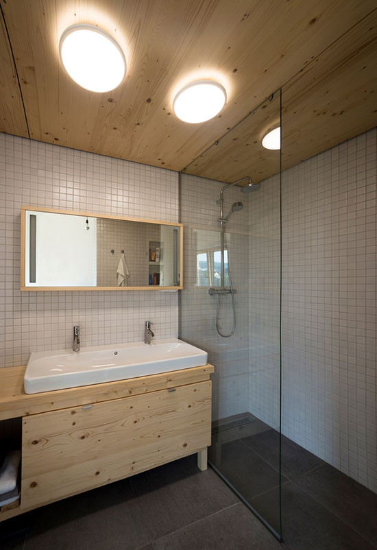 Po pitanju upotrebe drveta, kuća predstavlja bogatu zbirku uzoraka. Spoljašnjost kuće je presvučena neobrađenim sibirskim arišem, koji je vremenom postepeno menjao boju od zlatne u srebrno-sivu. Smreka, koja je inače tradicionalni lokalni materijal, široko je iskorišćena u enterijeru i pruža osećaj topline, udobnosti i blagostanja. Korišćena je i za pod, okvire prozora, vrata, ugradnu kuhinju i ormar dužine 14 m koji se neprekinuto proteže od centra kuće do spavaće sobe roditelja. Kolekcija prirodnih materijala, posebno drveta, koristi se kao kontrast postojećim betonskim zidovima. Dnevni boravak je otvorenog tipa i fluidno kombinuje kuhinju, dnevnu sobu i centralno postavljeni trpezarijski sto. Peć u dnevnoj sobi funkcioniše kao dodatni izvor toplote i grejanja. Ostale funkcije u domu, kao što su kupatila, tehničke prostorije i ostava, delovi kuhinje, biblioteke, dimnjaka i strukturni zidovi za skrivanje stepeništa, vizuelno su odvojene od spoljnih zidova, tako da je centralni životni prostor optički veći i omogućava veću slobodu unutrašnjih ruta i organizacije.