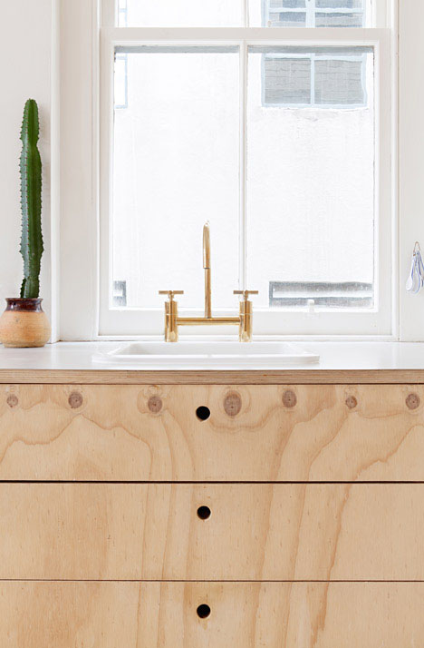 Ograničena paleta materijala koji su korišćeni pri dizajniranju ovog enterijera, iskorišćena je tako da poboljša osećaj prostora u stanu i smanji troškove. „Šperploča je jeftin i lako dostupan materijal, a koncept je dizajniran da može da ga izradi stolar što dovodi do dodatnog smanjenja troškova“, dodala je dizajnerka. U kupatilu su, kao i u spavaćem delu, korišćeni jeftiniji materijali poput pločica različitih veličina koje su korišćene da bi se dobio originalan izgled. Pozlaćene slavine su tu da bi se povećao osećaj luksuza.