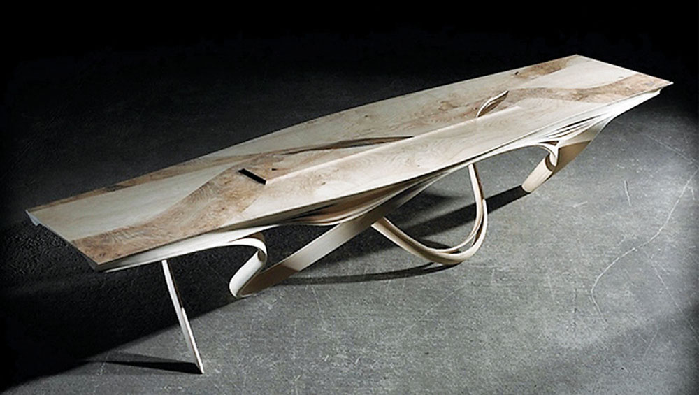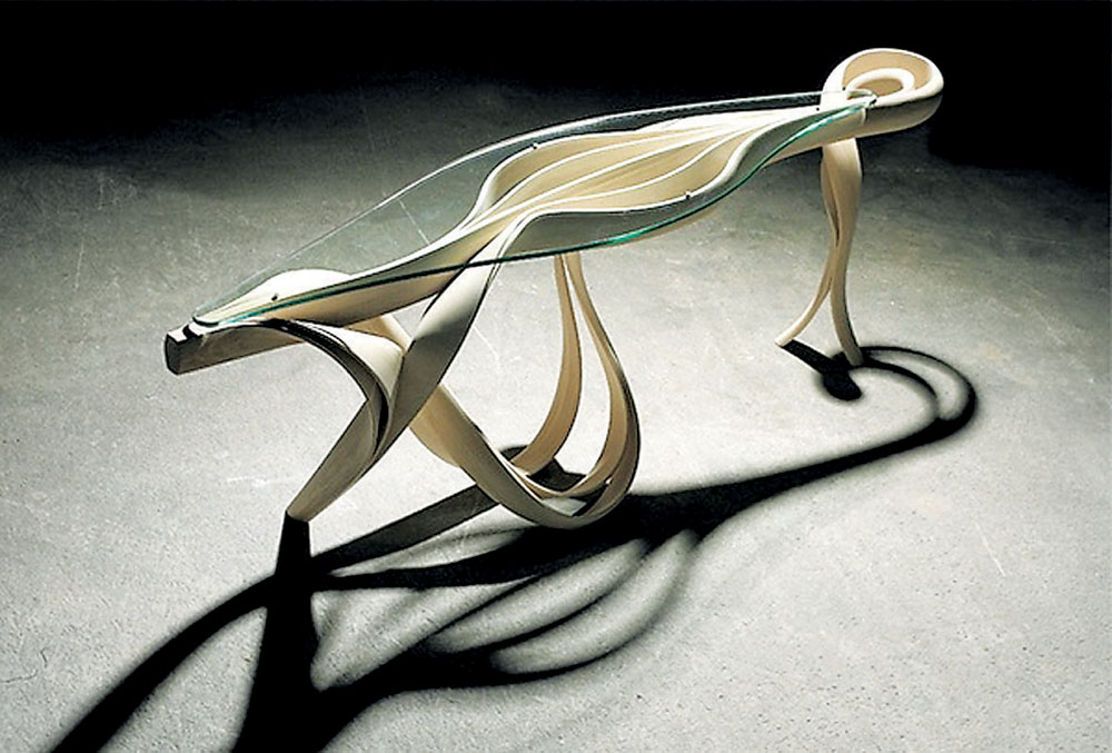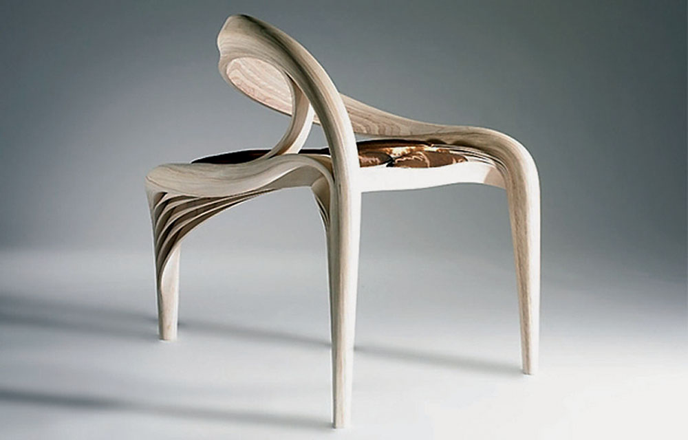 ritmičkim nizanjem tankih slojeva drveta u linijskim slojevima, koji su potom posebnom tehnologijom virtuozno oblikovani do veličanstvene kompozicije.