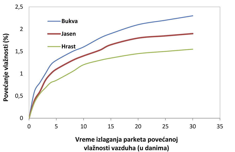 U prilog gore navedenim iskustvima prvo moramo istaći da vrsta drveta utiče na sklonost i brzinu upijanja vlage iz vazduha. Ukoliko parketne elemente od bukve, jasena i hrasta izložimo u prostoriji u kojem dolazi do promene vlage vazduha (sa npr. 50 na 75%) u toku 30 dana, najveću brzinu upijanja i promene vlage će imati bukva, zatim jasen, a najmanju hrast (Dijagram 1). Početna vlažnost parketnih elemenata je bila zanemariva. Kolege sa drvnotehnološkog smera u Zagrebu su u svojoj laboratoriji ispitivali i upijanje vlage za pojedine parketne elemente i utvrdili da jasenovina, pored bukve i hrasta, najbrže i najintenzivnije preuzima vlagu, čak je dostigla i veći sadržaj vode od onog predviđenog prema tablicama. U njihovom eksperimentu hrastovina je, takođe, bila najstabilnija jer je apsorbovala najniži sadržaj vode.