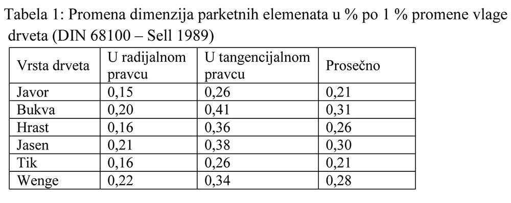 Kada govorimo o koritavosti jasno je da ona potiče od različite promene dimenzija sortimenata po procentu promene vlažnosti drveta (Tabela 1). Ovde treba napomenuti da kod gotovih podova mogućnost te deformacije je manja zbog slepljenosti elemenata i zbog potpunog otvrdnjavanja lepka u deformisanom stanju.
