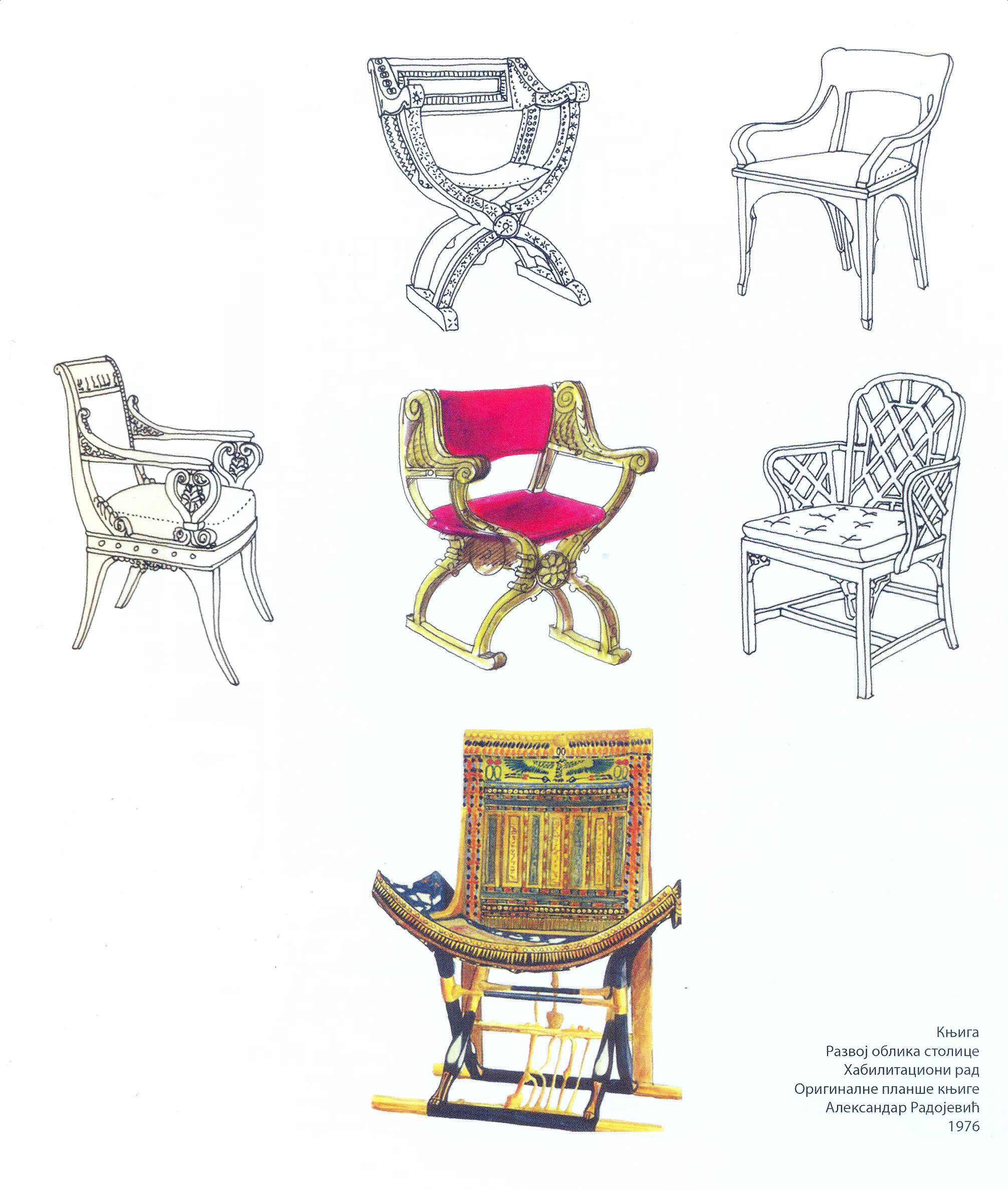 Profesor Radojević je posebno zaokupljen temom dizajna stolice, a svoje interesovanje proširuje i na istraživanje razvoja njenog oblika (pretočeno u publikaciju „Razvoj oblika stolice“, Beograd, 1974), pri čemu, naravno, drvene stolice čine gro komparativnog materijala. Valja reći da njegovo interesovanje za drvo potiče iz najranijih dana, još iz doba detinjstva – obožavajući ovaj materijal, on mu je bio i inspiracija za neke predstave i modele, u kojima će se roditi upravo jedan od glavnih, pionirskih kvaliteta Radojevićeve arhitekture – adaptibilnost prostora (a koji bi ga drugi materijal, osim drveta, dozvolio u većoj i savršenijoj meri?)