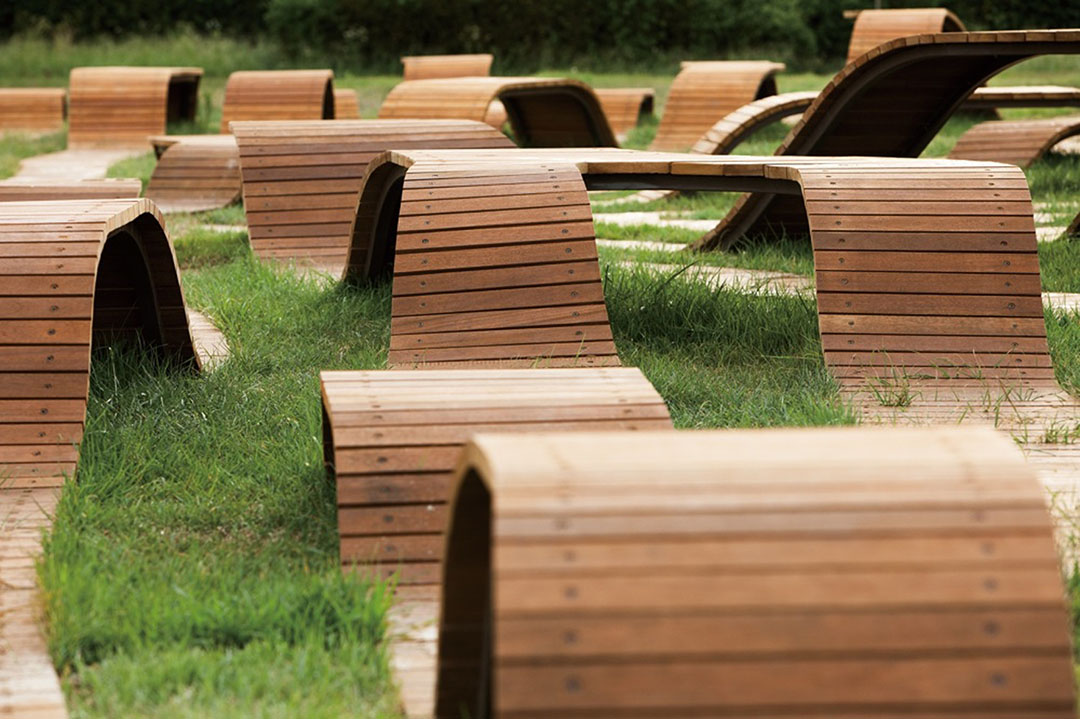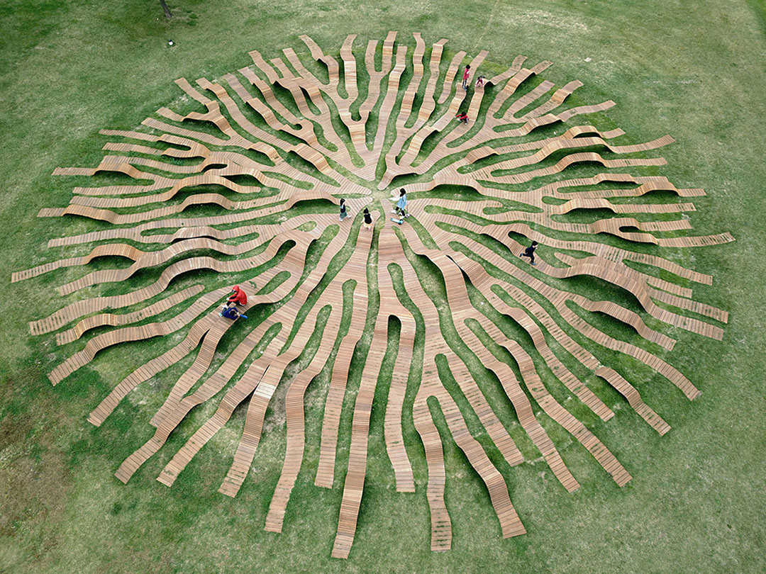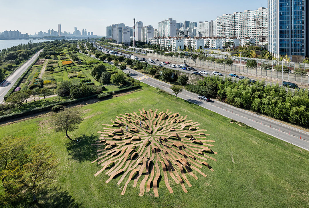 Primenom drveta kao poznatog materijala za završnu obradu ovaj mobilijar lako se konzumira i prihvata u ljudskoj svesti, ali i održava i uklapa u zeleni ambijent. Zrakasta i transparentna struktura stopljena je u travu, i na taj način briše granicu između veštačke instalacije i prirodnog okruženja. Dok komuniciraju jedni sa drugima, ili samostalno meditiraju, posetioci se osećaju prijatno u prostoru za odmor i istovremeno uživaju u umetničkom delu. Takođe, ovaj parkovski opus savršeno funkcioniše kao nameštaj sa tri različite visine: dečija stolica (250 mm), stolica za odrasle (450 mm) i sto (75 mm). Ovakvo ritmičko ustrojstvo nagoveštava novu dimenziju parka „Hangang” i pruža različite aspekte užitka.