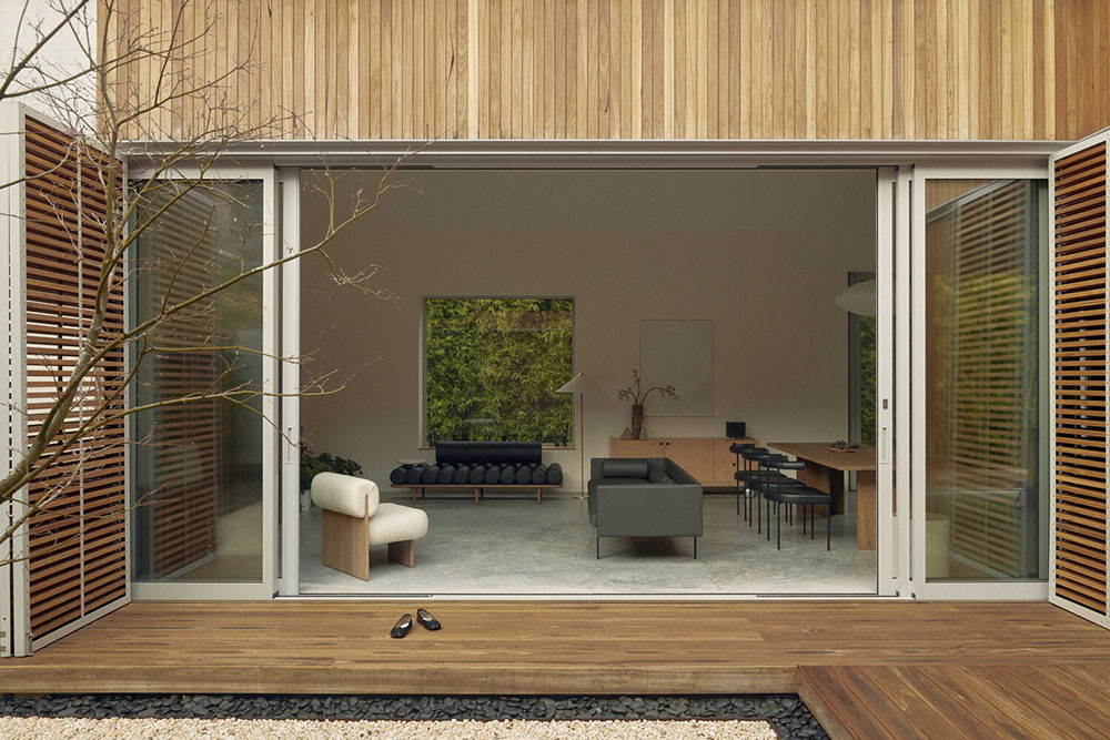 Glavni materijal oblikovanja dvorišta jeste drvo. Drvena lamperija ispod krovova, drveni dekovi i drveni zastori, dati su u različitim kompozicionim slogovima. Za njihovu izradu korišćene su lokalne, australijske vrste građe. Zajedno u kompoziciji obezbeđuju neophodnu prirodnost izraza, kao i taktilno-strukturalni kvalitet iste. U slučaju zastora, koji su adaptibilnog koncepta primene, efekat zasenčenja je samo jedan od dobijenih blagodeti. Bilo da se radi o letvama koje su u horizontalnom, bilo o onima u vertikalnom slogu, oni obezbeđuju impresivnu igru svetlosti i senke u unutrašnjem prostoru. Ovo harmonično i mirno utočište, diskretno ugnjezdeno između prometnih ulica grada, duguje svoj mir i toplinu umnogome drvetu kao materijalu. S obzirom da su drveni zastori pokretni, prostor dvorišta a i sam unutrašnji prostor kuće može imati hiljadu različitih lica, u zavisnosti od položaja ovih paravana. Takođe, i sam doživljaj dana i „protok svetlosti” može da se „podešava” zahvaljujući njihovom postojanju.