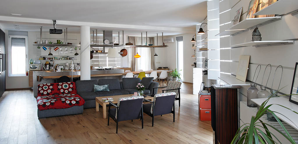 Iako jedinstvena, dnevna zona je funkcionalno podeljena na više ambijentalnih celina (kuhinja, trpezarija, lounge, prostor za gledanje filmova, radni deo), koje funkcionišu zajedno ali po potrebi mogu i da se i odvoje. S obzirom da vlasnici vole da kuvaju ali i da se druže, ova dva bitna segmenta njihovog života su spojena, rezultujući velikom otvorenom kuhinjom kao epicentrom prostora. Trpezarijski sto i šank su takođe od hrastovih dasaka, ostavljenih u sopstvenoj, natur boji. Drvo u kombinaciji sa inoksom stvara neophodan kontrast u kompoziciji, što dovodi do njene razigranosti, ali prevaga izraza u svakom trenutku počiva na drvetu, kao toplijem, „životnijem”, a samim tim i nadmoćnijem elementu.