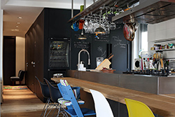 Nadomak kuhinje smešten je „crni kubus” – funkcionalno-oblikovna jedinica koja sadrži rashladne vitrine za hranu i vino, kupatilo, spavaću sobu… Napravljen je kao obloga od crnog medijapana, koji ima mogućnost pisanja i brisanja kredom, kao školska tabla. Bilo da ga koriste kao dnevni podsetnik obaveza, notes za kulinarske recepte, svesku porodičnih poruka, on predstavlja nešto kao živi album vlasnika.