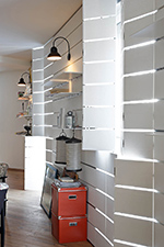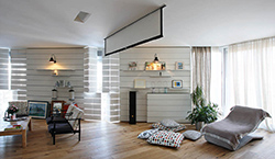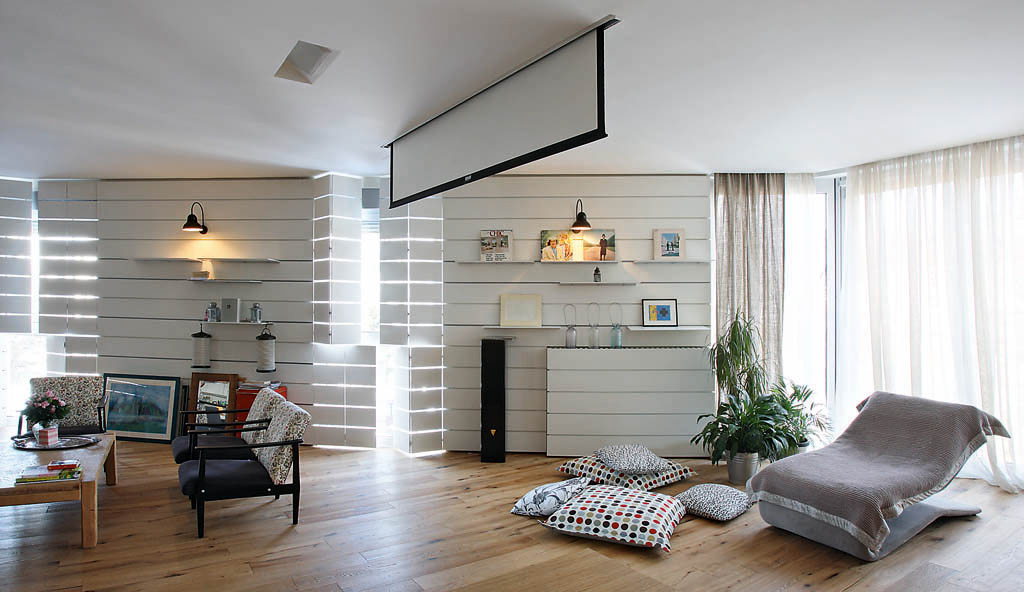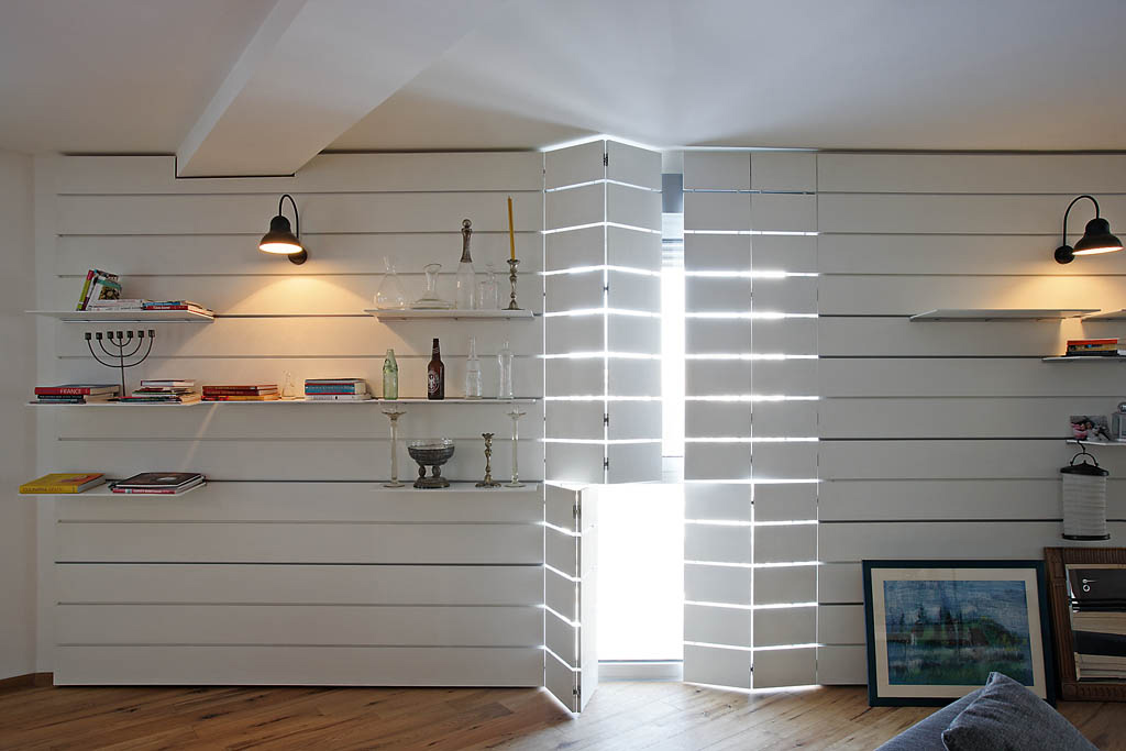 Zahvaljujući drvenoj daščanoj oblozi prostor stana ima izrazit karakter metamorfozibilnosti. Uz nju život u stanu postaje dinamičan, sklon brzom i lakom menjanju atmosfere. Ne samo uz pomoć svetlosti, lice prostora se menja i fizičkim zahvatima – promenom rasporeda polica koje su postavljene u prorezu između dasaka na fiksnim delovima drvene obloge. Njihovim pomeranjem levo-desno, vađenjem i/ili stavljanjem ispod-iznad, prostor se nepresatno menja, osvežava, i povrh svega pruža vlasniku mogućnost da konstantno i samostalno interveniše u sopstvenom životnom kutku.