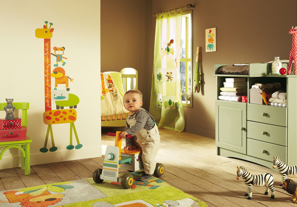 Funkcionalnost, udobnost i sigurnost su imperativi dečjeg namještaja. Sve ivice moraju biti zaobljene, šrafovi skriveni, a montaža stabilna. Preporučuju se tople obloge podova. Tepisi bi trebalo da budu od prirodnih vlakana, poput pamuka, lana i vune. Njima se mogu prekriti gajtani i kablovi koji su interesantni za ispitivanje. Tome se pridaje poseban značaj kada beba krene da puzi i igra se na podu. Dovoljno prirodnog svetla se mora obezbediti u dečjim prostorima, ali važno je da ono ne pada direktno na kolevku ili krevetac. Draperijama i zavesama od prirodnih materijala dovoljno se ublažava intenzitet direktnih sunčevih zraka. Bebama smeta jako svetlo, naročito pred spavanj. Poželjni su potenciometri kojima se može regulisati intenzitet veštačkog osvetljenja.