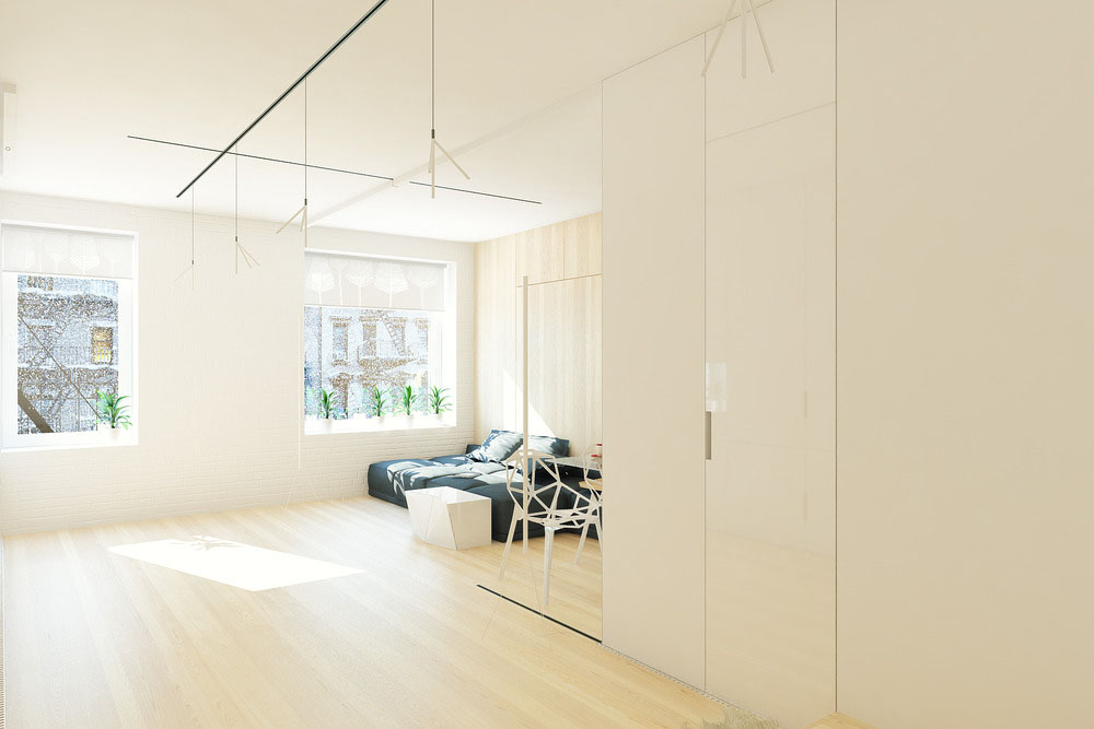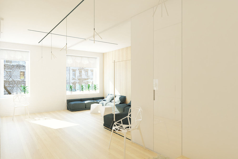 Organizacija malih prostora zahteva modularan ili multifunkcionalan nameštaj koji ne iziskuje mnogo mesta, vizuelno ne opterećuje i ne smanjuje neophodnu slobodnu površinu namenjenu kretanju čoveka. Bitno je da takav enterijer bude univerzalno korišćen, elementi da da budu funkcionalni i da ne zatvaraju linije komunikacija. Svako drugačije organizovanje stvorilo bi disharmoniju, zbog toga se potencira likovna jednoobraznost i dimenziona ujednačenost elemenata. Potrebno je voditi računa o balansu proporcija malog stana ili garsonjere i svih elemenata koji čine njihov organizam. Adekvatnim izborom boja, nameštaja, rasvete i detalja, bilo koja prostorija se može učiniti većom. Izbegavaju se masivne, velike garniture, tamnih boja. Adekvatan izbor su svetlije palete, manje ugaone garniture ili sofe na razvlačenje. Kada su u funkciji kreveta, prilikom odabira prvenstveno bi trebalo obratiti pažnju na kvalitet izvlačnog mehanizma, izradu potkonstrukcije ležaja, vrstu i stišljivost podloge, kako bi spavanje bilo što zdravije. Stanove manjih dimenzija najčešće karakteriše otvorena komunikacija među prostorijama i smanjivanje broja klasičnih pregradnih zidova. Tako se u jednom domu ne ograničavaju celine, nego se integrišu u jedan sistem, a vizuelno blokovski definišu. Međutim, ukoliko postoji mogućnost, deo za spavanje je poželjno odvojiti. U funkciji pregrade, pored zida, mogu biti i klizna vrata, plakar ili polica. Navedeni pristup odvajanju segmenata nalazi sve veću primenu u savremenim enterijerima, a predstavlja multifunkcionalni sistem. Takav, organski postupak je mnogo efikasniji, jednostavniji i, često jeftiniji, a stvara funkcionalno jezgro u unutrašnjosti pregrade. Na isti način bi se i drugi elementi, poput radne ploče stola ili pomoćnog ležaja mogli upakovati.
