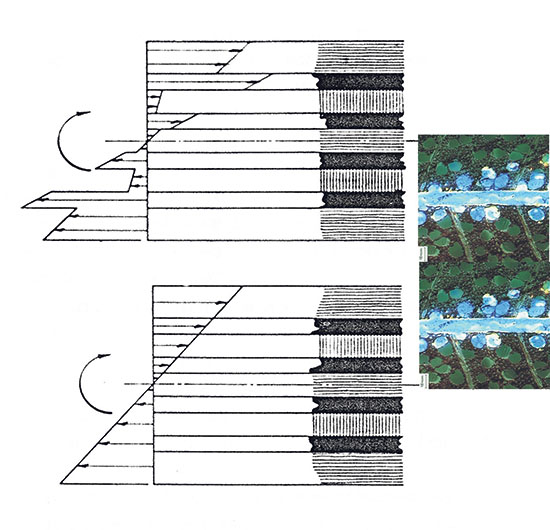 Slika 1: Naponi i deformacije koji nastaju pri savijanju furnirske ploče (najveća naprezanja su u linijama lepljenja najudaljenijim od neutralne ose)