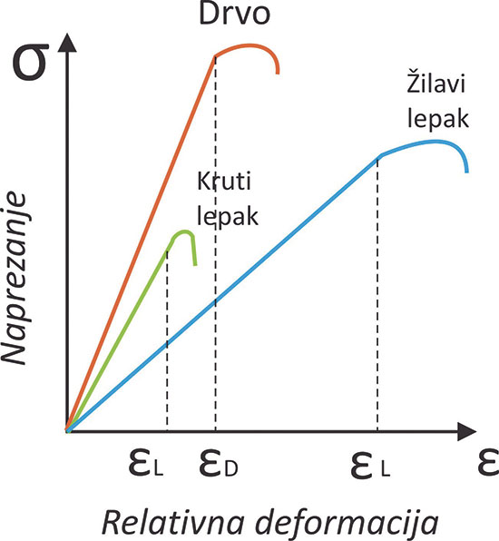 Prilikom ispitivanja lepljenih spojeva, spoj treba da bude bar onoliko jak koliko je i samo drvo, pa je jedan od osnovnih kriterijuma površina loma po drvetu (poželjno je da ona bude što veća). To znači da sljubnica (lepljeni spoj) mora da bude bar toliko elastična da prati deformacije ostalih slojeva drveta (ili drugog sistema, ako je u pitanju lepljenje različitih materijala). Zbog toga je potrebno da elastičnost lepljenog spoja bude usklađena sa elastičnošću drveta (Slika 2).