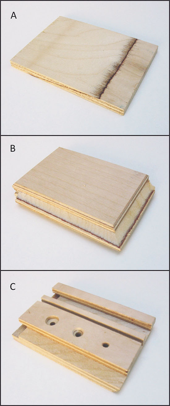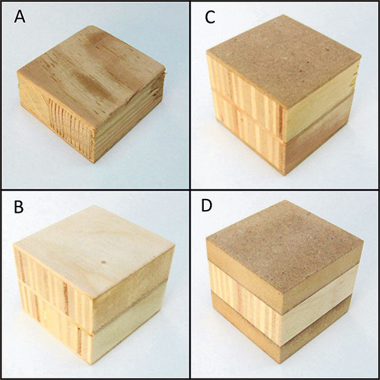 I kada je u pitanju stolarska ploča (panel), topolov furnir od trupaca lošijeg kvaliteta je našao primenu (Slika 5). Prikazana je stolarska ploča od bora (A), stolarska ploča debljine 43mm sa kvalitetnom srednjicom od topolovog furnira (B), stolarska ploča debljine 43mm sa kvalitetnom srednjicom od topolovog furnira i tri sloja od MDF ploče debljine 3mm (C), i stolarska ploča debljine 43mm sa kvalitetnom srednjicom od topolovog furnira i dva spolja sloja od MDF ploče debljine 12mm.