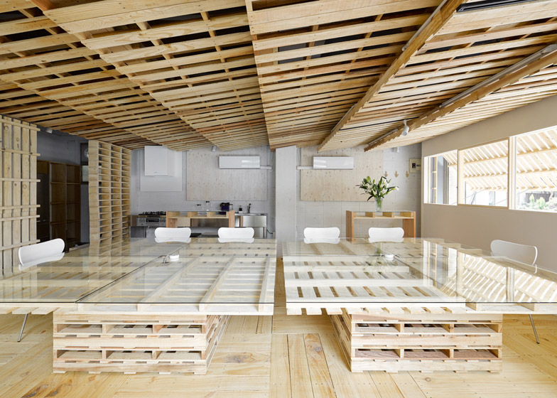 Za izradu ove privremene kancelarije u Tokiju bilo je potrebno više od 100 drvenih paleta koje su prvobitno korišćene za transport. Lokalni dizajnerski studio Hiroki Tominaga Atelier je prihvatio zadatak da prostoriju od 50 kvadratnih metara pretvori u kancelariju za sastanke.