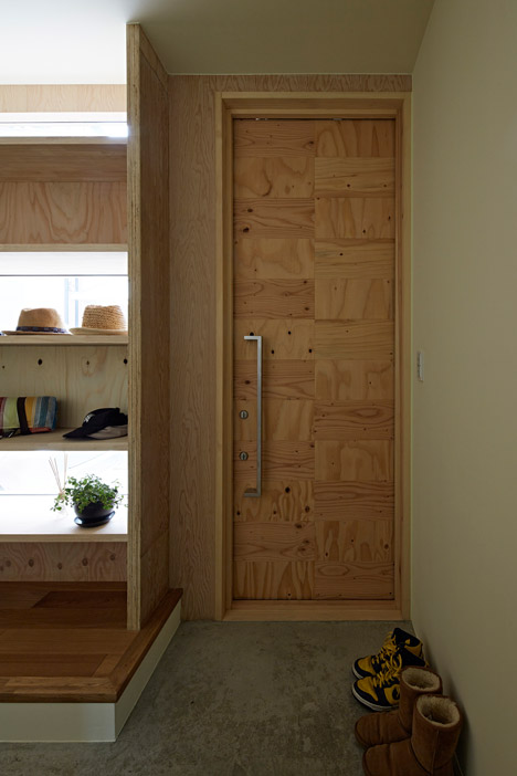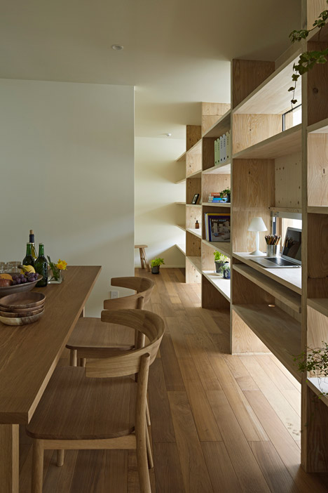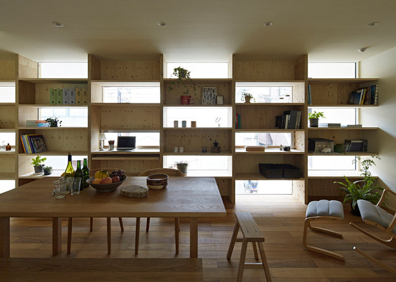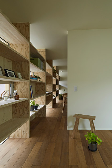 Drvene kutije - police ugrađene su u neprozirnim, drrvenim delovima dvospratne fasade, i nalaze se na svim spoljnim zidovima prostorija, a nude više nego dovoljno prostor za skladištenje i izlaganje svim ukućanima.