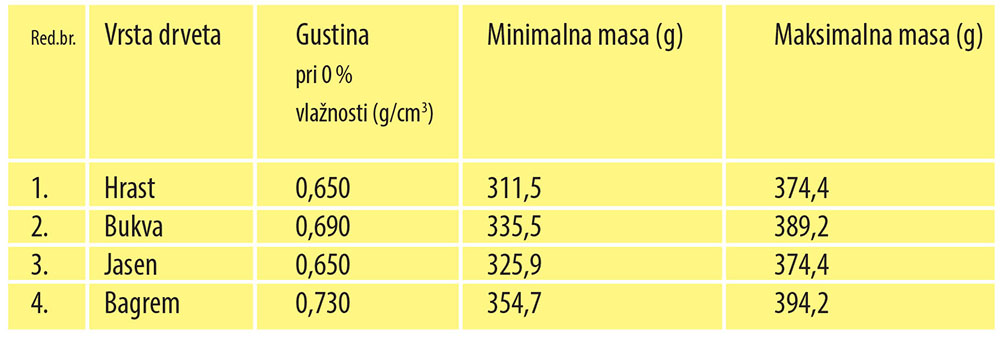 Kao primer, za prethodno navedeno, navešćemo podatke koji su dobijeni za klasičnu parketnu daščicu dimenzija 400x56x22 mm izrađenu od hrasta, bukve, jasena i bagrema (Sedlar i dr. 2015). U tabeli 1. su dati podaci o minimalnoj i maksimalnoj masi koje te daščice treba da imaju da bi ispunili uslov vlažnosti i gustine za datu vrstu drveta. Odstupanje mase iznosi 1,38 % što je podatak koji je dobijen kao odnos stvarne prema idealnoj zapremini parketne daščice i kao takav nije tehnološki značajan.