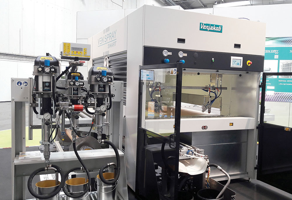 Od mašina za lakiranje prikazane su mašine za valjanje za obradu ravnih površina, praćene UV ili UV LED lampama za očvršćavanje premaza. Za obradu pločastih elemenata sa 5 strana (jedna šira strana i uže strane) predstavljeni su automati za lakiranje, najčešće sa linearnim kretanjem raspršivača sa različitim sistemima za prikupljanje materijala nanetog van predmeta obrade. Uklanjanjem materijala sa transportne trake sprečava se prljanje zadnje strane predmeta obrade uz istovremeno povećanje procenta iskorišćenja materijala (slika 3 i slika 4).