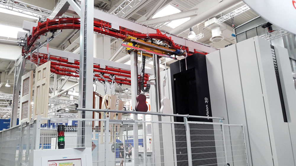 Za sklopljene proizvode razvijen je sistem 3D skeniranja koji omogućava precizno očitavanje svih nepravilnih, teško uočljivih udubljenja i ispupčenja na površini predmeta koje je potrebno obraditi lakiranjem (slika 5). U ovom sistemu predmeti obrade su okačeni na viseći transporter, a materijal se nanosi robotom za prskanje, što omogućava lakiranje sa svih strana i sušenje na malom prostoru, zahvaljujući paralelnom slaganju predmeta obrade u prostoru za sušenje. Uz to, ova linija može biti opremljena jedinicom za automatsko postavljanje i skidanje predmeta obrade na početku, odnosno kraju ciklusa obrade.