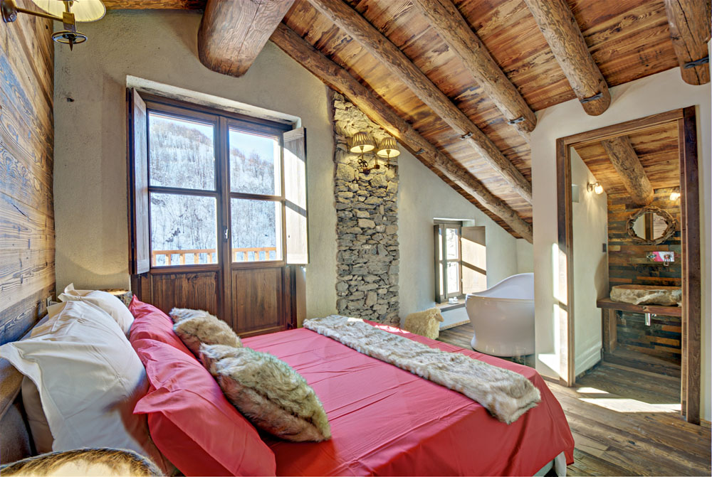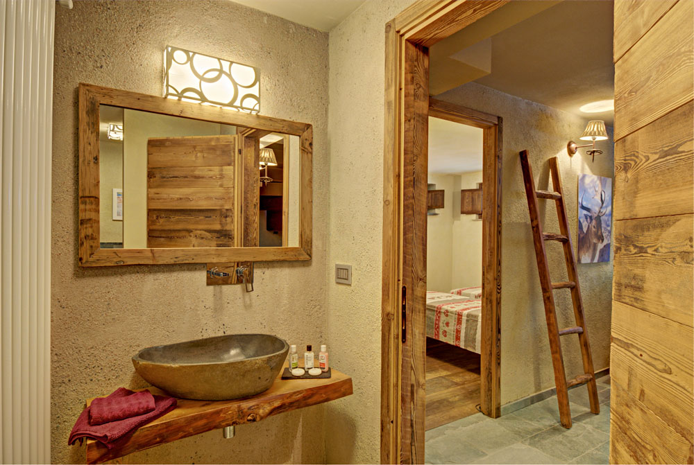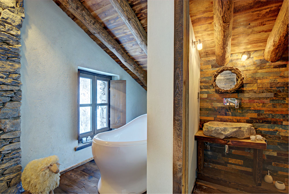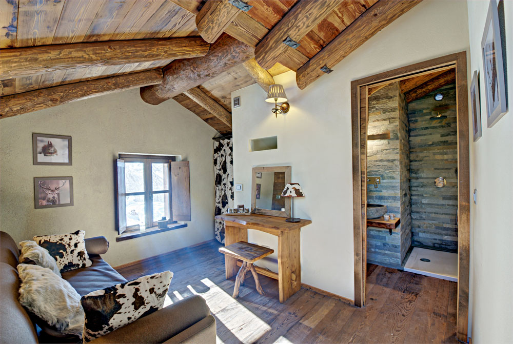 U skladu sa ekološkim prizvukom i stilom ostatka enterijera izveden je i nameštaj u planinskoj brvnari. Izrađen je po meri. Većina nameštaja izrađena je od obnovljenog starog drveta. Ugaona garnitura i fotelja u dnevnoj sobi ojastučeni su posebno tretiranom kožom koja mu daje starinski izgled, ali i mekan i topao osjećaj na dodir. Stolice u trpezariji ojastučene su Alcantara tkaninom. Kuhinji i kupatilu takođe je dat rustičnan izgled, a da pritom nije uskraćen moderan komfor. Dizajner Phillipe Starke dizajnirao je opremu u kupatilu, uključujući i Sensowash Duravit toalet i bide, kojima se upravlja bežično. Oni su japanskog stila i imaju površinu za sedenje koja se greje. Rustični izgled kuhinje naglašen je dekorativnim starinskim priborom koji se koristio decenijama ranije.