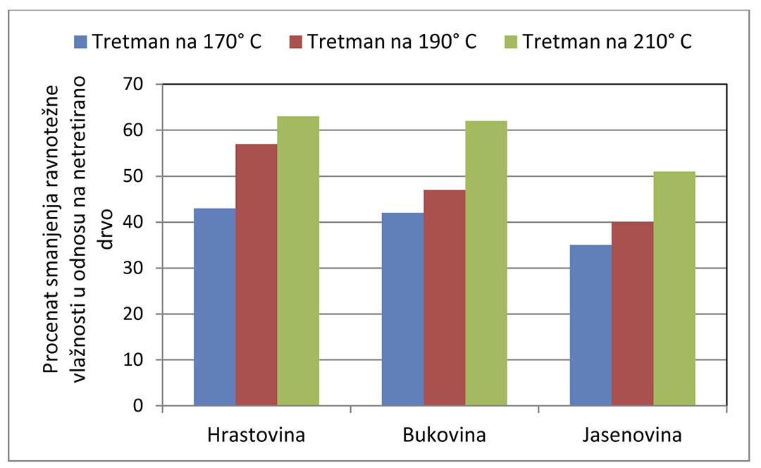 Dejstvom visoke temperature dolazi do značajnog smanjenja higroskopnosti odnosno ravnotežne vlažnosti drveta (grafikon 1). Blaži tretmani na 170°C i 190°C dovode do redukcije ravnotežne vlažnosti za od 35-55%, dok intenzivan tretman na 210°C ima za posledicu smanjenje higroskopnosti za 50 do 62 %.