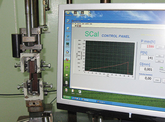 Slika 7: Alat sa postavljenim uzorkom ploče od masivnog drveta na automatskoj mašini za ispitivanje prema EN standardu (foto: Zdravković)