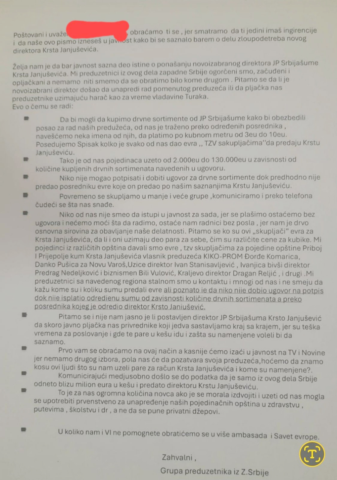 Želja nam je da javnost sazna bar deo istine o ponašanju novoizabranog direktora JP Srbijašume Krsta Janjuševića. Mi preduzetnici iz ovog dela zapadne Srbije ogorčeni smo, začuđeni i opljačkani a nemamo niti smemo da se obratimo bilo kome drugom. Pitamo se da li je novoizabrani direktor došao da unapredi rad pomenutog preduzeća ili da pljačka nas preduzetnike uzimajući harač kao za vreme vladavine Turaka?