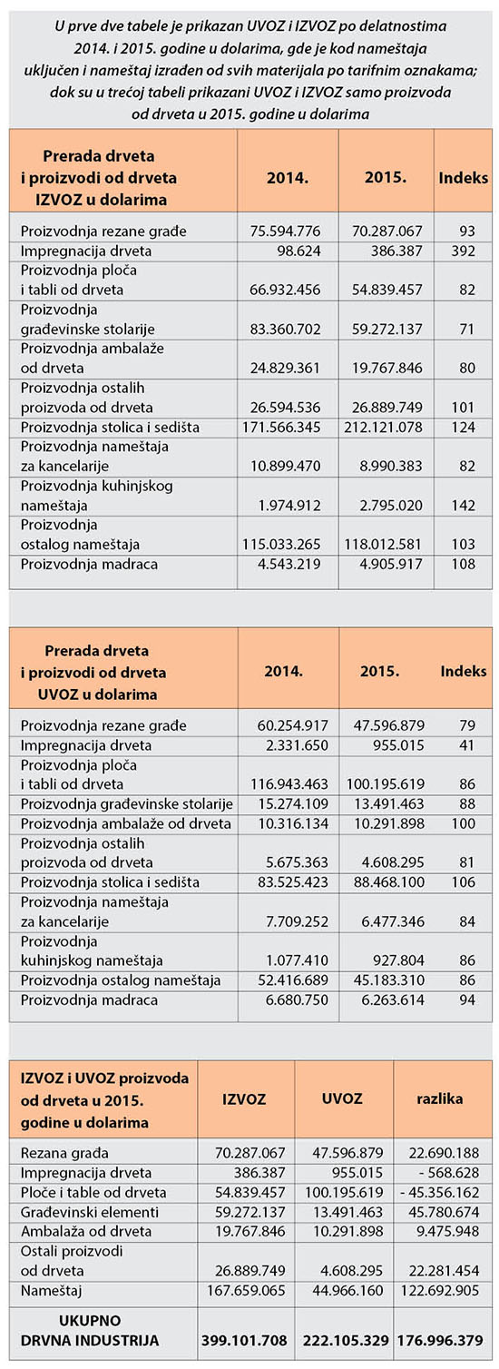 U Srbiji je proizvodnja nameštaja u 2015. godini bila približno na nivou prethodne godine, odnosno ostvareno je povećanje proizvodnje od 0,9%, ali je proizvodnja ostalih proizvoda od drveta bila manja za 7,2% nego u 2014. godini. Ukupan izvoz proizvoda iz ove delatnosti je na nivou prošlogodišnjeg izvoza i iznosi 573 miliona dolara. Značajan je podatak da je izvoz nameštaja 2015. godine bio veći za 12% nego prethodne godine, iz čega se zaključuje da je došlo do povećanja izvoza proizvoda sa višim stepenom obrade u odnosu na poluproizvode. Ukupan izvoz nameštaja u 2015. godini iznosi 342 miliona dolara. Na ovakav pozitivan pokazatelj pre svega utiče izvoz sedišta za motorna vozila, čiji izvoz iznosi 144 miliona dolara. Kada je reč o nameštaju od drveta, ukupan izvoz iznosi 168 miliona dolara i manji je za 8% nego 2014. godine. I uvoz je manji nego 2014. godine i to za 17% i iznosi 45 miliona dolara. Iz ovoga vidimo da je nameštaj od drveta i 2015. godine ostvario značajan suficit u spoljnotrgovinskoj razmeni i to od 123 miliona dolara. Ako posmatramo sve proizvode od drveta vidimo da je izvoz 399 miliona dolara, a uvoz 222 miliona, što predstavlja suficit od 177 miliona dolara. Iz ovih podataka možemo da zaključimo da je drvna industrija jedna od retkih grana industrije Srbije koja konstantno ostvaruje spoljnotrgovinski suficit u robnoj razmeni sa inostranstvom. Od svih grana drvne industrije jedino proizvodnja ploča i tabli od drveta ostvaruje deficit, ali i tu ima pozitivnih pomaka jer je uvoz ploča smanjen za 17% u odnosu na 2014. godinu, pa samim tim i deficit. Činjenica je da u poslednjih nekoliko godina dve fabrike ploča iverica i fabrika lesonit ploča u Srbiji ostvaruju značajnu proizvodnju koja pozitivno utiče na smanjenje deficita.