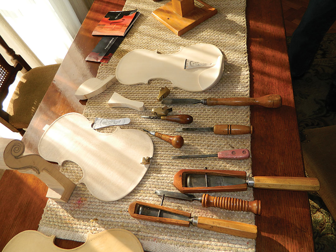 – Slavni Gasparo da Salò je konstruisao violinu 1524. godine, ali ona do svog savršenstva linija, arhitektuire i zvuka dolazi kod Stradivarija, koji je uspeo da, u ogromnim katedralama u kojima se tada svirala violina, dobije savršen zvuk. U Srbiji prvu violinu imali smo na dvoru Milana Obrenovića… Violine starih italijanskih majstora toliko su bile savršene da do danas nije bilo potrebe da se tu išta menja, od izbora materijala, preko oblika, do načina izrade. Drvo od kog se izrađuje violina je javor, za donju i bočne strane i puž sa vratom, a gornja ploča je od smreke. Praktično, imamo imenicu i muškog i ženskog roda, javor i smreka, i kada se to sve lepo sklopi to je kao jedna bračna zajednica. Dominantna kod ovog instrumenta je glasnjača, gornja ploča koja trpi najveće opterećenje. Ona sa svojim godištima, ukoliko je iskopana po svim parametrima i principima kopanja i gradnje gudačkih instrumenata, i ukoliko se instrument uradi i namesti kako treba, mora da zadovolji sve akustične performanse u bilo kojoj sali u kojoj se muzika izvodi, priča Jovan Popović, i nastavalja sa divljenjem – Imamo filharmoniju, tu su timpani, horne, basovi, čela, ogromna količina zvuka, i odjednom se pojavi jedan instrument koji je mnogo iznad i koji sve nadjača… To je violina.