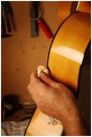 Ukoliko je šelak prvi premaz na drvetu, brzo će penetrirati i već za oko sat vremena će površina biti dovoljno suva i spremna za narednu obradu (brušenje podignutih vlakanaca). Ponavlja se isti proces nanošenja („postavljanja”) kao gore opisan. Sušenje traje jednu noć i nakon tog vremenskog perioda ploča je spremna za brušenje koje se odvija u sledećim fazama: brušenje brusnim papirom numeracije 320 i brušenje čeličnom vunom (sintetički čelik). Nakon brušenja na ploču se još jednom nanosi smola i ostavlja se preko noći da se osuši. Osušena površina se brusi čeličnom vunom 0000 i polira voskom. Kada se vosak osuši, obriše se višak mekom pamučnom krpom. Površina izgleda jako lepo i sjajno nakon ovakve ručne površinske obrade.