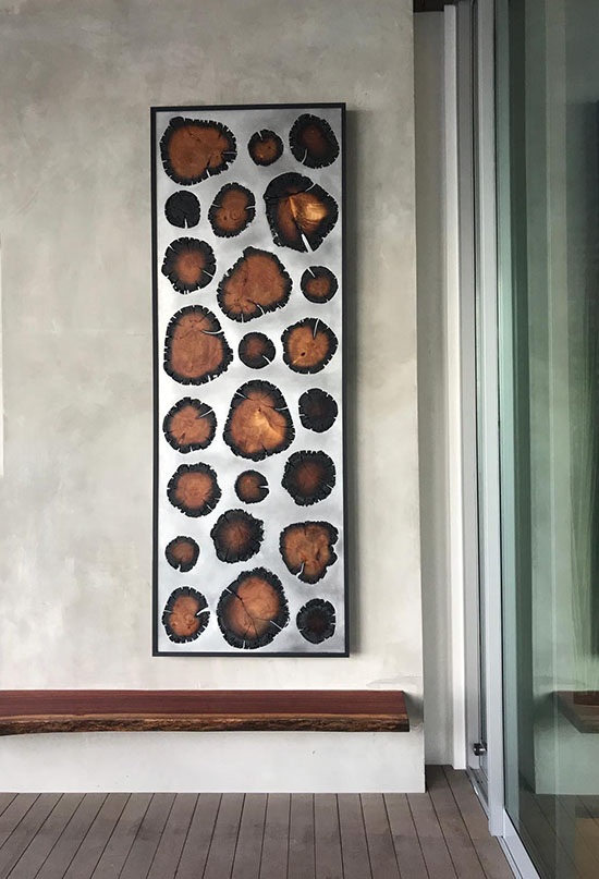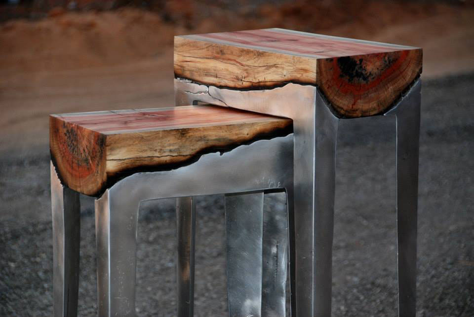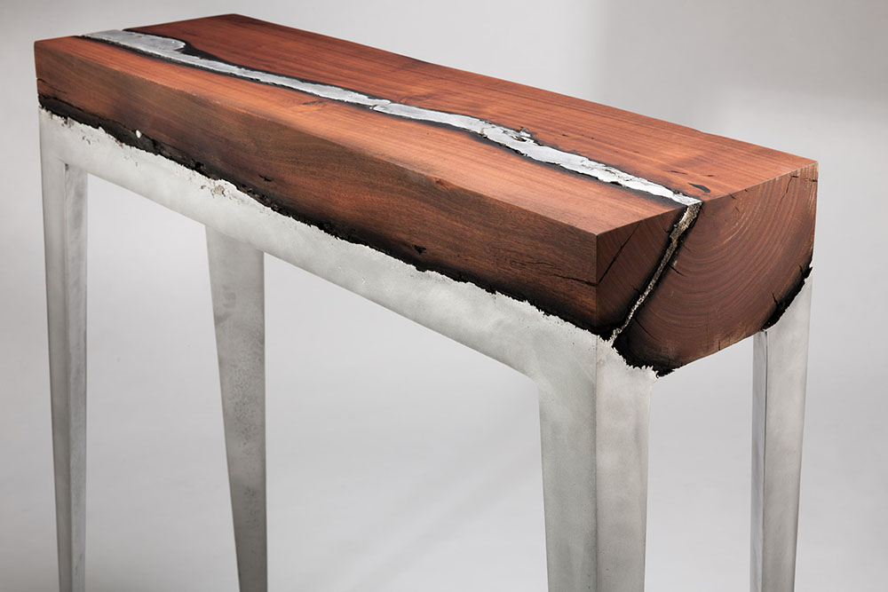 Ovi drveni trupci, isečeni najčešće po dužini, odlikuju se ne samo upečatljivom strukturom i crtežom, već i koloritom. Kada se u kalupe u kojima su utopljeni drveni komadi sipa vreo rastopljeni metal, prilikom kontakta ove dve materije na površini sirovog drveta stvara se crni ugljenisani sloj, koji u likovnom smislu predstavlja žižu kompozicije. Crna „granica“ egzistira između dva kontrastna materijala – hladnog, glatkog i sjajnog srebrnog, i toplog, rustičnog i matiranog drvenog medijuma. Na taj način, mogući negativan faktor izgorelog drveta pretvara se u estetsku i emocionalnu vrednost, očuvanjem prirodnog oblika stabla, i uvođenjem prirodne granice „industrijske“ intervencije. Opšta, kvadratna forma pojačava arteficijalni oseć aj, a istovremeno čuva seć anje, „prasliku“ prirodnog. S obzirom da je metal bio u tečnom stanju kada je nanošen na trupce, on se nalazi u svakoj pukotini drveta, stvarajući jaku fizičku vezu i upečatljivi vizuelni izgled. Svaki komad nameštaja koji potekne iz Šamijine radionice predstavlja unikat i ručni rad. Šamin kreativni rad utemeljen je na savremenom istraživanju formi, ali i materijala, odnosno odnosa materijala.