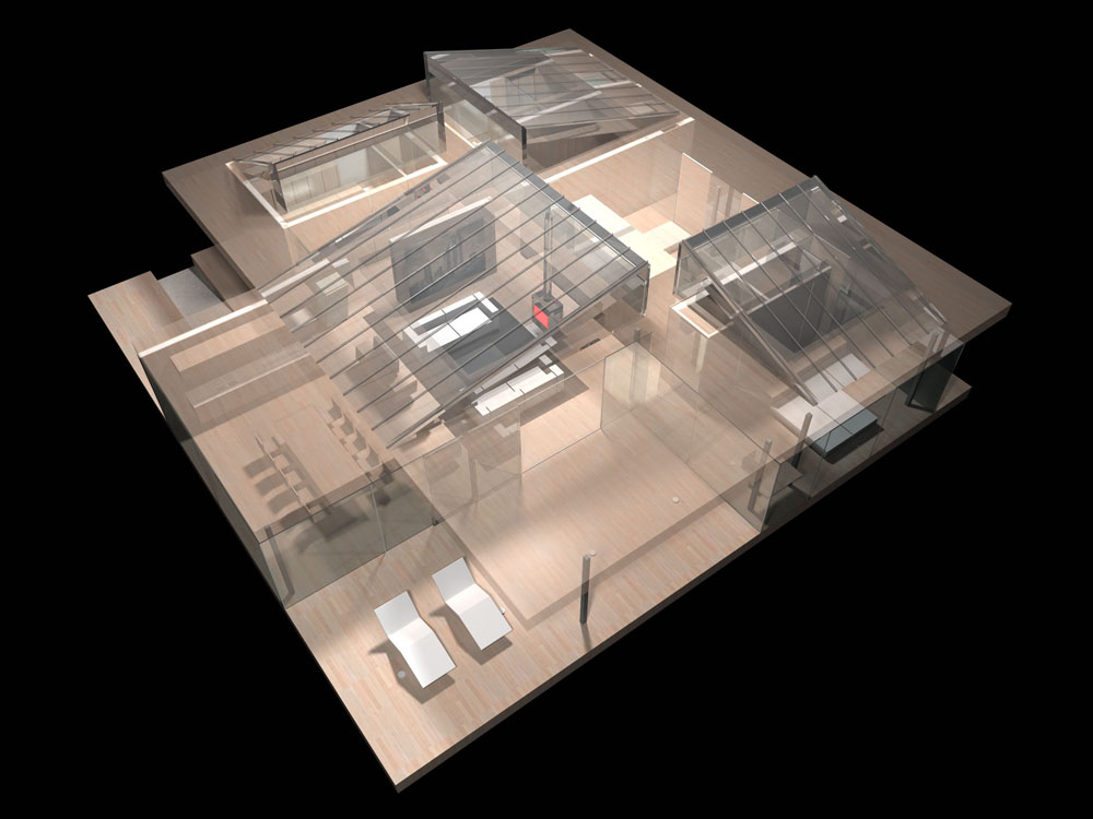 U unutrašnjosti kuće sproveden je poznati autorov princip fluidnosti prostora, koji rezultira otvorenošću prostora, lakom komunikacijom i adaptibilnošću ambijenta. Uz to, čitav prostor se kupa u svetlosti. Sistemi prirodnog osvetljenja i prirodne ventilacije, kao i grejanja i izolacije, realizovani su pod striktnim ekološkim principima tako da maksimalno štede energiju i u najvećoj meri se oslanjaju na naturalne resurse. Kada se uz sve ovo ima u vidu i činjenica postojanja staklenih spoljnih zidova, postajemo svesni da je izbrisana i poslednja granica između kuće i njene okoline. Na taj način arhitektura i priroda ponovo postaju jedno, čime je dosegnut davnašnji ideal njihovog jedinstva.