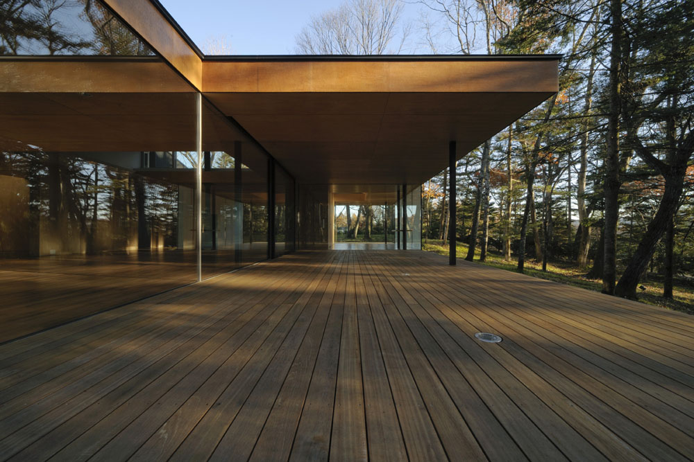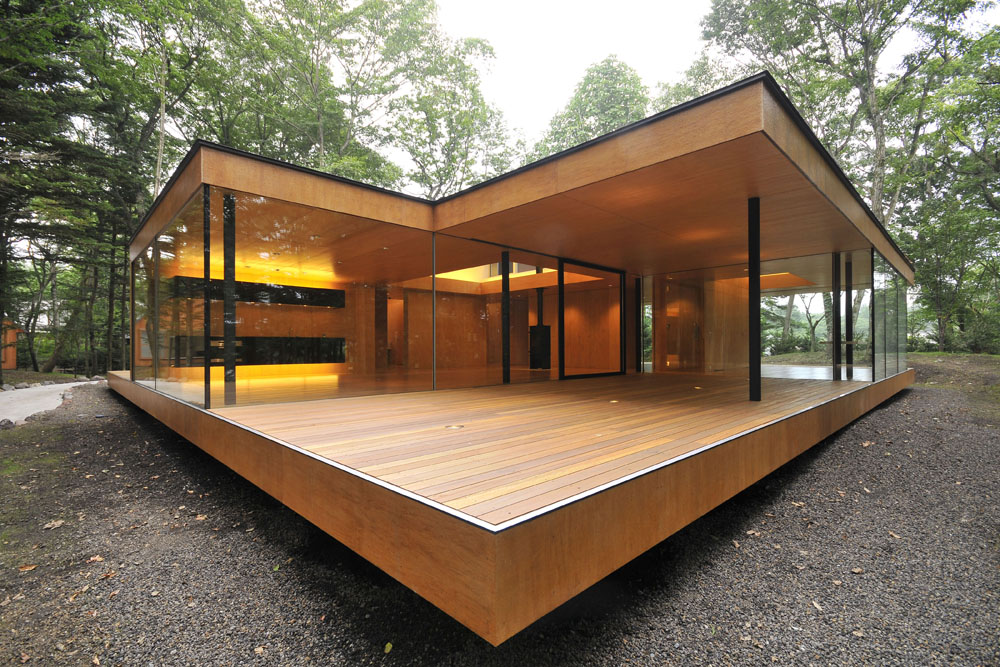 Tekstura drveta koje je upotrebljeno na objektu vezana je za njegovu besprekornu tehnološku i finalnu obradu, pri čemu je čvrsto nastojano da se zadrži što prirodniji, odnosno, autentičniji kolorit. Dominantna forma upotrebljenog drveta kako u enterijeru tako i u eksterijeru jesu drveni paneli „China-gohan“ glazirani tečnim „FRP“-om, sredstvom iz najsavremenije tehnologije koje čini drvo potpuno zaštićenim od oštre i vlažne klime, a u isto vreme čuva njegov prirodan izgled. Unutar kuće drvo je iskorišćeno kao obloga gotovo svih ravnih površina (podova, plafona, zidova), a od njega je izrađen i najveći deo pokretnog mobilijara.