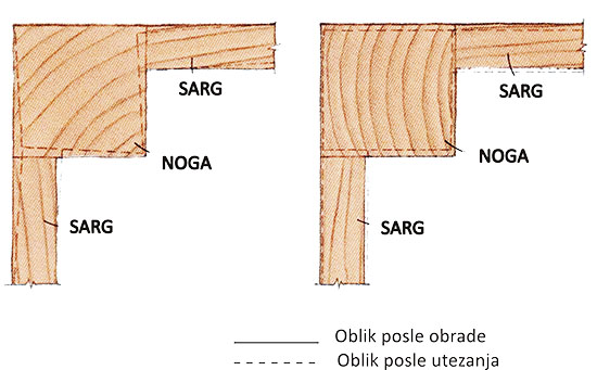 Slika 2. Primer različite promene oblika i dimenzija kod noge stola izrađene iz elemenata koji su imali različit položaj u trupcu