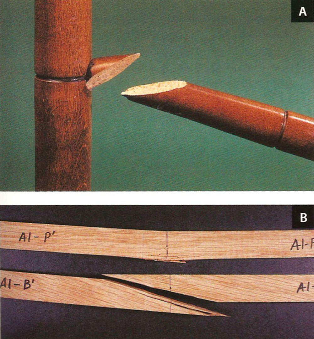 Slika 4. A-lom izazvan savijanjem usled prerezanih drvnih vlakanaca pod uglom; B – gore: izgled loma bez prerezivanja vlakanaca; dole: izgled loma sa prerezivanjem vlakanaca pod uglom