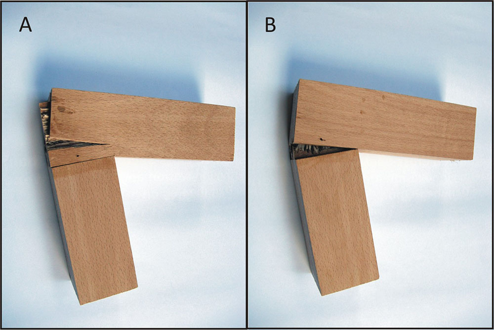 Slika 6: A-loš spoj: šire strane oba elementa usmerene su u tangencijalnoj ravni; B – manje loš spoj: šira strana noge usmerena je u tangencijalnoj ravni a šira strana prečke u radijalnoj;