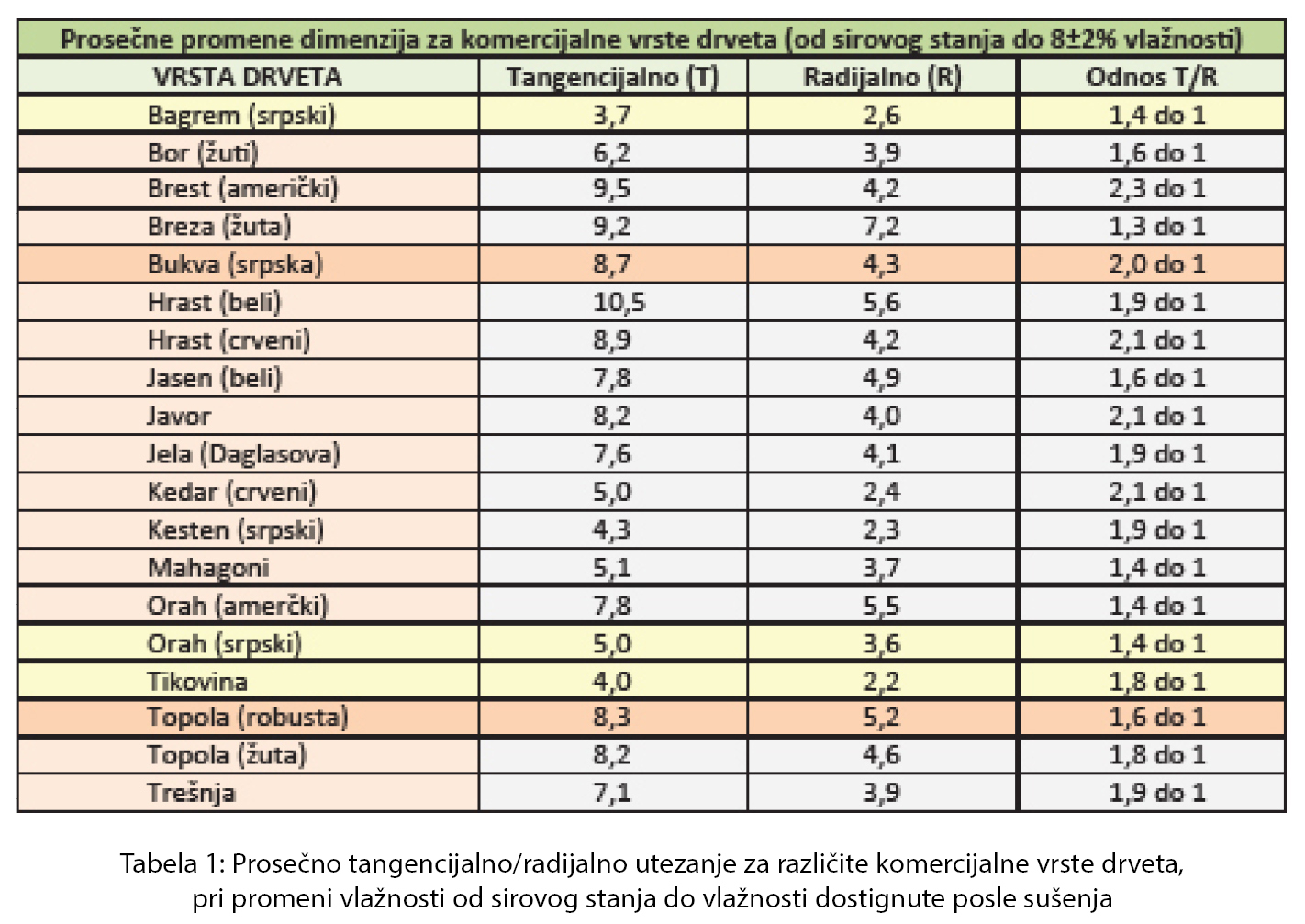 Prosečne promene dimenzija (pri promeni vlažnosti od sirovog stanja do vlažnosti posle sušenja, koja je pogodna za spajanje drveta: 8±2%) u tangencijalnoj i radijalnoj ravni, kao i njihov odnos, za različite komercijalne vrste drveta prikazani su u tabeli 1.