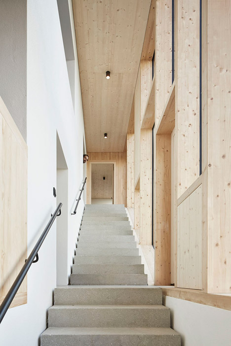 “Drveni okvir konstrukcije je namenjen da se stvori kontrast između nove drvene i stare betonske strukture”, kaže arhitekta. “Prozori generišu sofisticirani obrazac koji nudi kako otvorene tako i zatvorene prostore unutar objekta.”