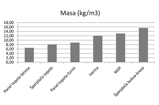Ako se uporedi masa po m2 različitih ploča, iste debljine (18 mm), tada je najlakša ploča po 1 m2 topolova stolarska ploča sa srednjicom od letvica (6,53 kg/m3), što je dvostruko manje nego standardna iverica iste debljine (12,06 kg/m3) ili MDF (13,05 kg/m3) (slika 2). Najveću masu po m2 ima kombinovana šperploča bukva-breza (15,58 kg/m3) ali su u pitanju po prirodi znatno teže vrste drveta. Ovi podaci imaju praktični značaj jer govore, na primer, o tome da su kuhinjska vrata istih dimenzija od standardne iverice 46% teža nego ista vrata izrađena od panela a ako su vrata od MDFa onda su teža 50% nego ako su izrađena od panela.