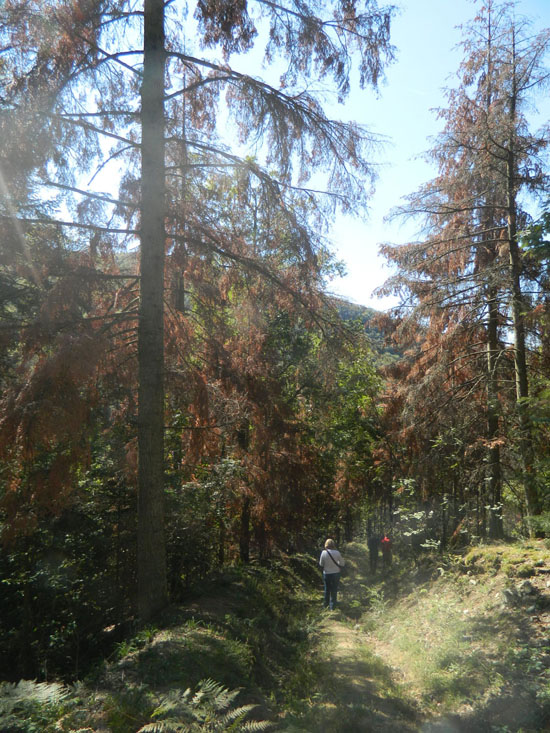 Trenutni negativni efekti na šumskim ekosistemima su u Srbiji očigledni. Sušenje šuma je prisutno na celoj teritoriji. Na severu u Vojvodini najviše se suši cer, u brdskom pojasu kulture i veštački podignute sastojine četinara, a u planinskom pojasu smrča, jela i bukva. Na pojedinim lokalitetima (NP Tara, Goč, Čemerno i drugim) intenzitet je takav da su ugroženi osnovni postulati održivog upravljanja šumama, a odnose se na stabilnost, proizvodnost i samoobnovljivost šuma. Trajnost proizvodnje, prinosa i prihoda su ugrožene posebno na ekstremnijim staništima na serpentinitu i peridotitu. Sušenje je dinamičkog karaktera i po izvršenoj sanitarnoj seči šuma opet požuti i pocrveni za najviše mesec dana.