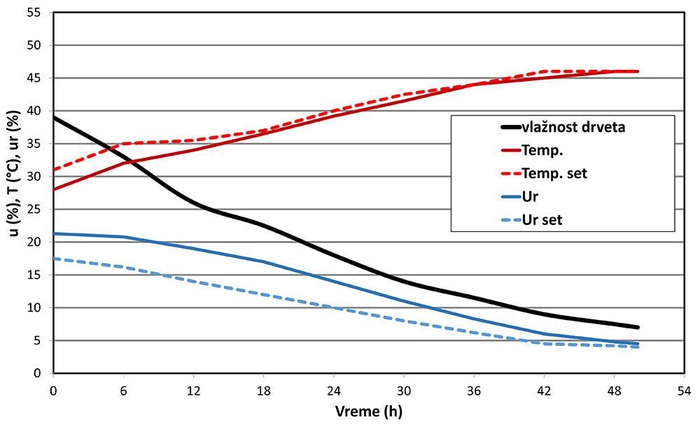 Na slici 2 prikazana su dva ciklusa sušenja hrastovih lamela debljine 5 mm, jedan u kondenzacionoj (slika 2a) i jedan u konvencionalnoj sušari (slika 2b). Može se uočiti da je sušenje u konvencionalnoj sušari trajalo duže, ali su osnovni uzroci tome viša početna vlažnost drveta i veća količina lamela u ovoj sušari (za oko 1/3 veća količina). Ono što je za obe sušare zajedničko je da imaju problem da snize relativnu vlažnost vazduha (time i ravnotežnu vlažnost) na zadate vrednosti. Ovo je naročito izraženo na početku procesa (kasnije nešto manje). Na dijagramima je vidljivo da je puna plava linija (izmerena ravnotežna vlažnost) kontinuirano iznad isprekidane plave linije (zadata ravnotežna vlažnost), tj. da je ravnotežna vlažnost u sušari značajno viša od zadate (maksimalno za 5% kod kondenzacione, a za 4% kod konvencionalne sušare).