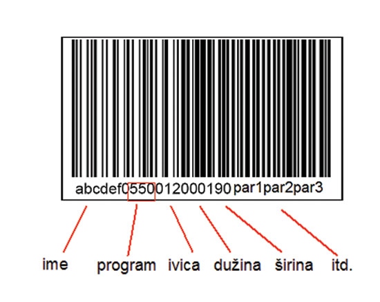 Pri upotrebi bar-koda u industriji nameštaja postoji dosta parametara koji moraju biti dobro definisani. Program, radne dužine, radne širine i debljine, boja ivice su samo od nekih parametara koji moraju biti definisani, (slika 2).
