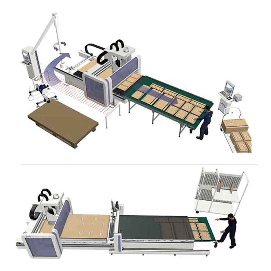 Na slici 3 prikazana je operacija krojenja ploča na Nesting centru. Ovakav način obrade predstavlja najsavremeniji sistem koji je i kod nas sve više prisutan. Pokretna glava koje se kreće po portalu vrši automatsko lepljenje etiketa na predmet rada. Identifikacione nalepnice imaju bar-kod koji u sebi sadrži sve potrebne podatke predmeta rada (koja se strana ivično obrađuje, pozicija detelja u proizvodu i drugo). Pored bar-koda etiketa može sadržati i shematski prikaz elementa sa dimenzijama. Ovakvim načinom identifikacije smanjuje se mogućnost greške ljudskog faktora na minimum.